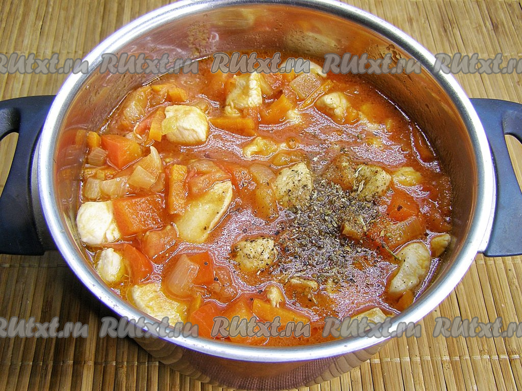 Протушившиеся овощи перекладываем в кастрюлю с обжаренными кусочками курицы, вливаем 200-250 миллилитров воды (мясо и овощи должны быть полностью покрыты водой), солим, перчим, перемешиваем. При желании можно долить и больше воды.