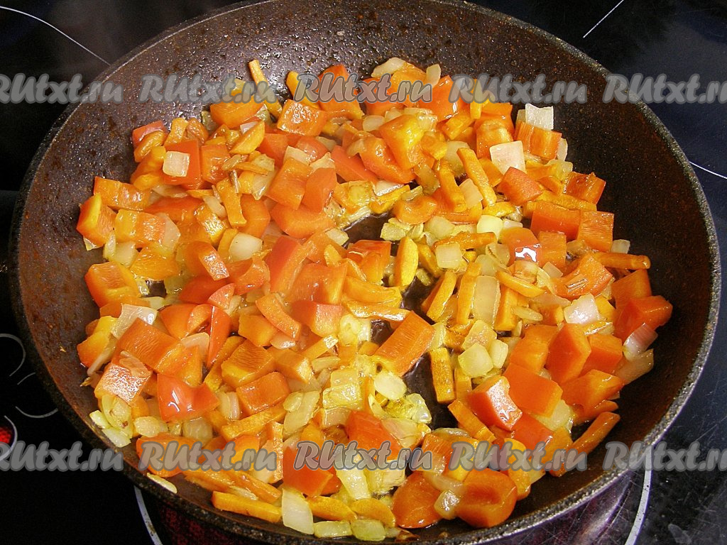 Нарезанный перец добавляем в сковороду с обжаренными морковкой и луком, перемешиваем. Обжариваем овощи 4-5 минут (до мягкости перца), иногда помешивая.