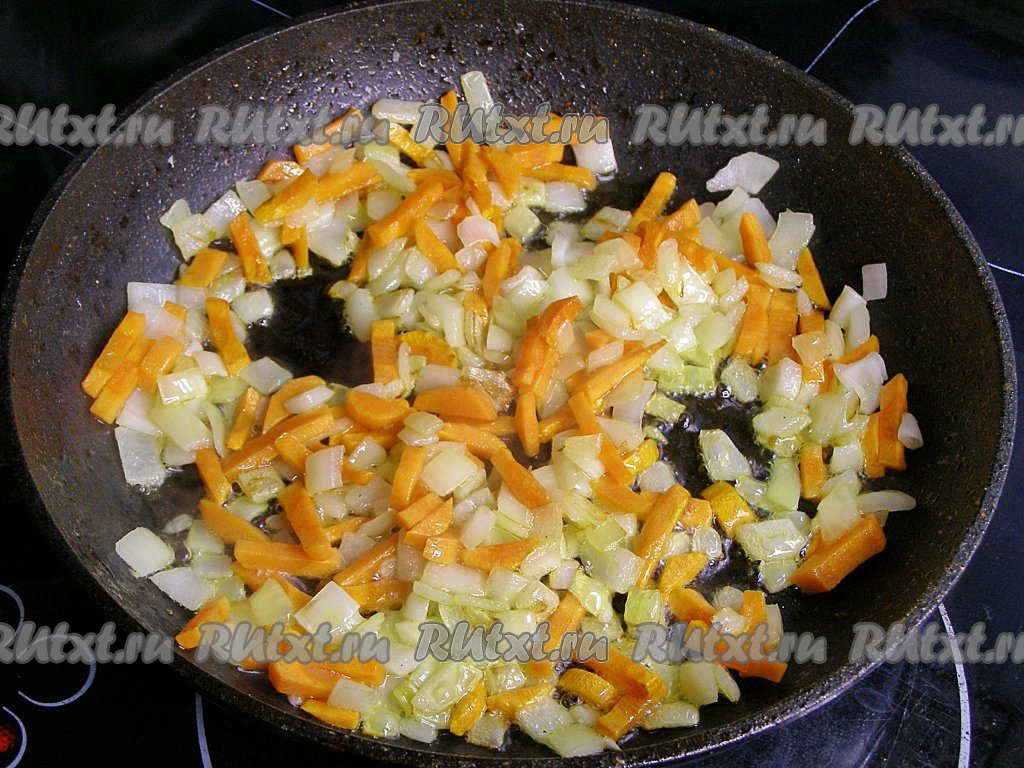 Очищаем луковицы и морковь. Лук нарезаем на кубики среднего размера, морковь - на тонкие брусочки (или полукружочки). В сковородку ещё раз наливаем растительное масло, разогреваем и кладём в него нарезанные лук и морковь. Обжариваем овощи, иногда помешивая, до мягкости морковки (ориентировочно 6-7 минут).