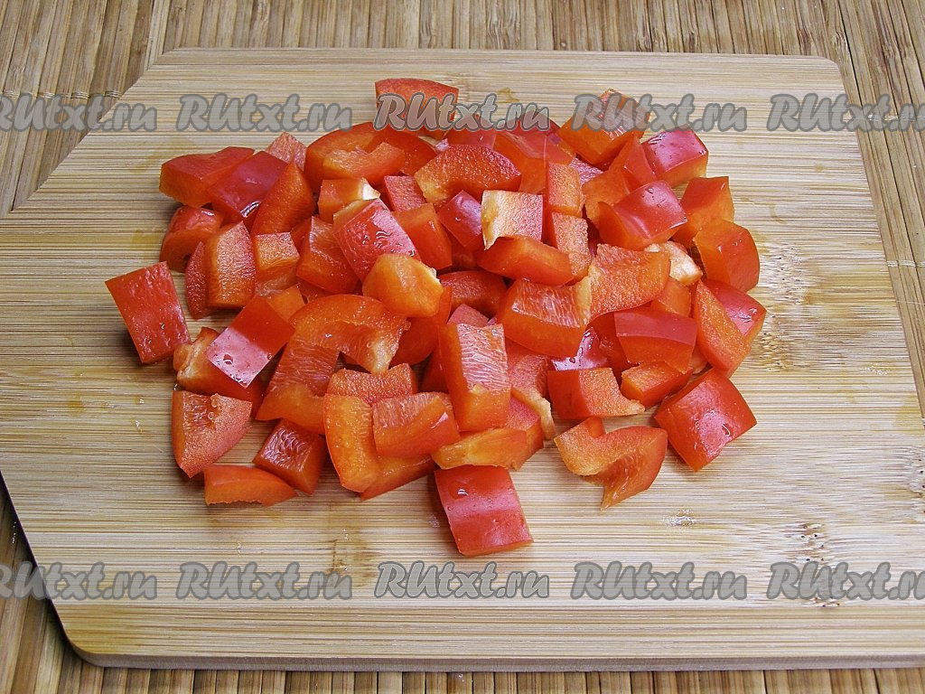 Из болгарского перца удаляем семена, убираем плодоножку, нарезаем его кубики.