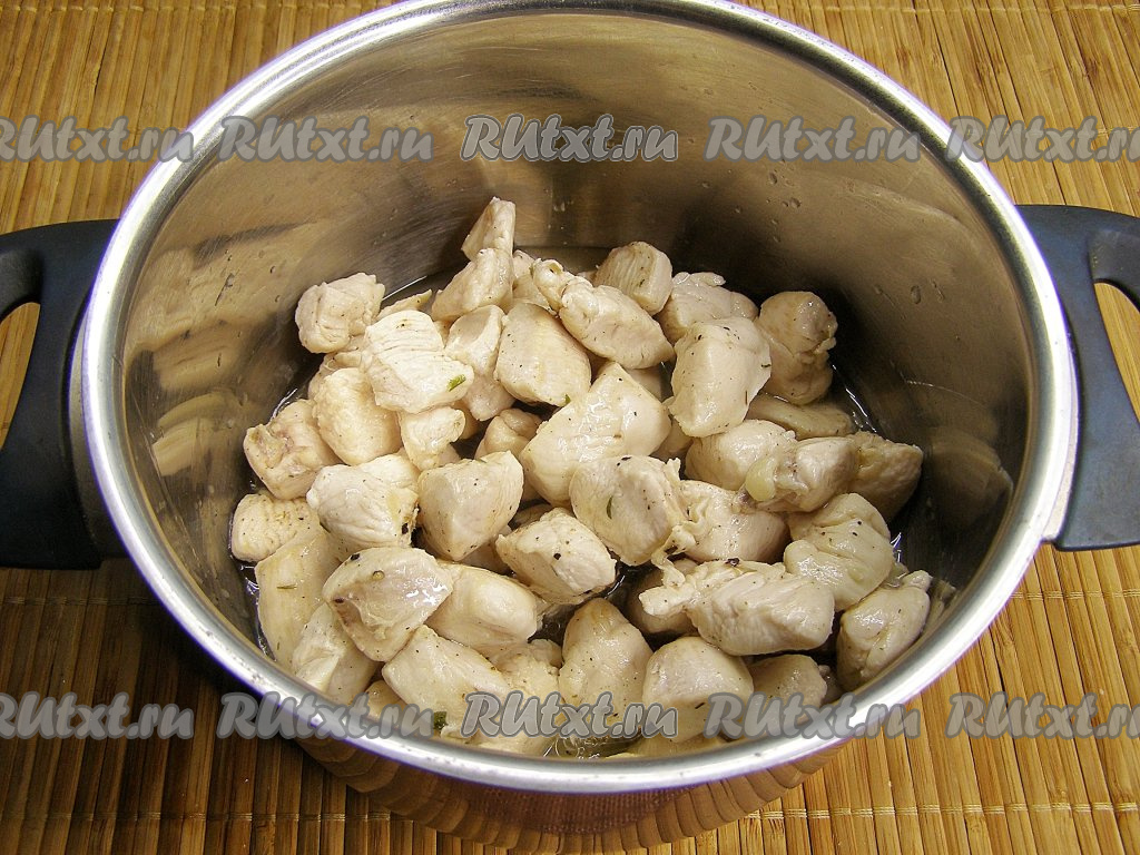 В сковородке разогреваем растительное масло, выкладываем кусочки куриного мяса, обжариваем на среднем огне, периодически помешивая, пока кусочки курицы не посветлеют и не покроются лёгкой золотистой корочкой (минут 10). В конце обжаривания курицу солим, перчим, ещё раз перемешиваем и снимаем с огня.