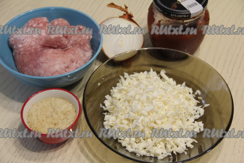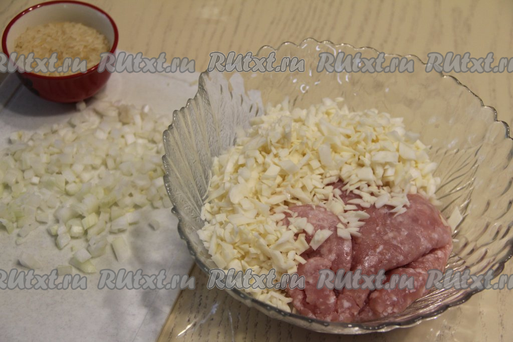 Подготовить продукты. Для получения фарша нужно кусочки мяса (у меня - свинина) пропустить через мясорубку. Можно взять и покупной фарш. Лук почистить. Капусту мелко нарезать. Рис промыть водой и оставить в сите, чтобы стекла лишняя вода.