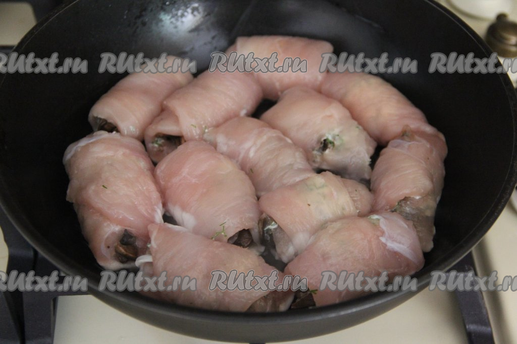 В сковороду влить растительное масло, хорошо разогреть его на достаточно сильном огне. Выложить в сковороду сформированные куриные рулетики с грибами.