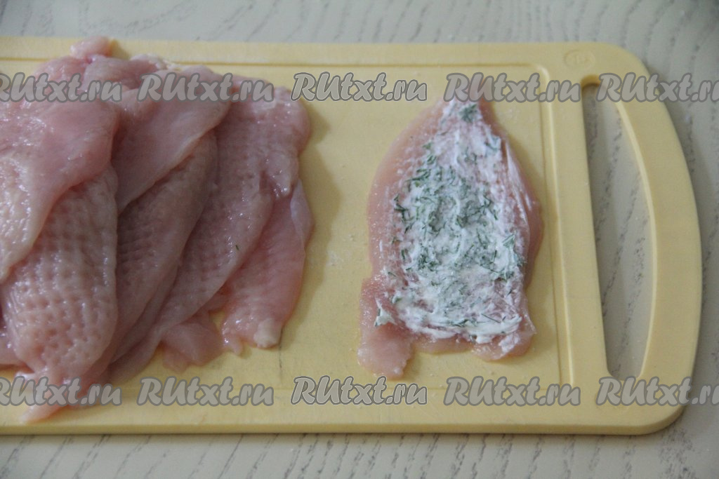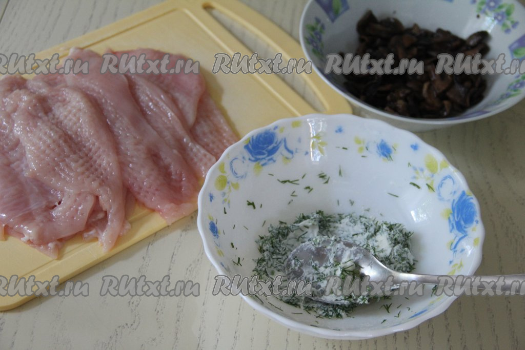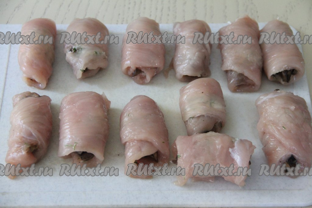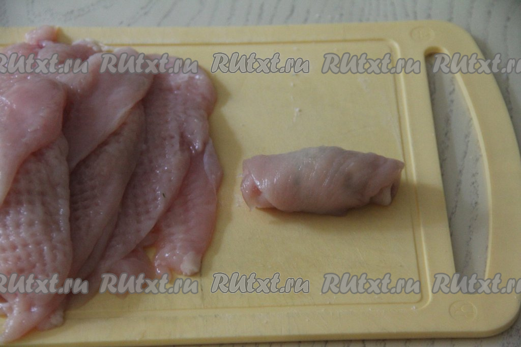 Свернуть куриную отбивную в плотный рулет, начиная со стороны с грибами.