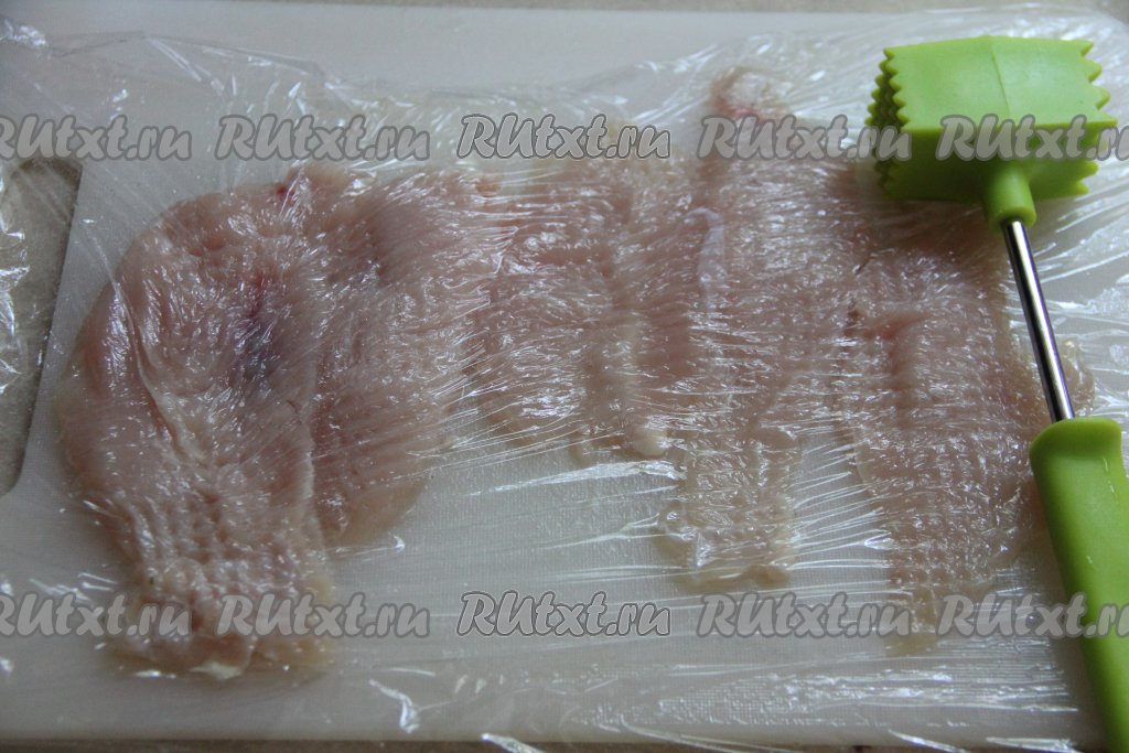 Выложить кусочки куриного мяса на разделочную доску и, накрыв пищевой плёнкой, отбить кухонным молоточком. Пласты мяса должны получиться достаточно тонкими.