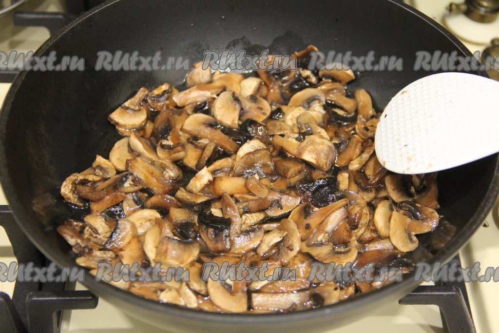 В качестве начинки для куриных рулетиков можно взять и шампиньоны, и вешенки, и лесные грибы. Лесные грибы нужно будет предварительно отварить в течение 25-30 минут, после этого слить лишнюю воду, дать грибам остыть и нарезать крупные грибочки на части. Свежие шампиньоны и вешенки нужно будет промыть водой, нарезать на части. Я готовила с замороженными шампиньонами, уже нарезанными на пластины, размораживать их не нужно. На сковороде прогреть растительное масло, выложить подготовленные грибы и обжарить их на среднем огне, иногда помешивая, до готовности (в течение 12-15 минут), посолить. Жареные грибы убрать с огня, дать им остыть.