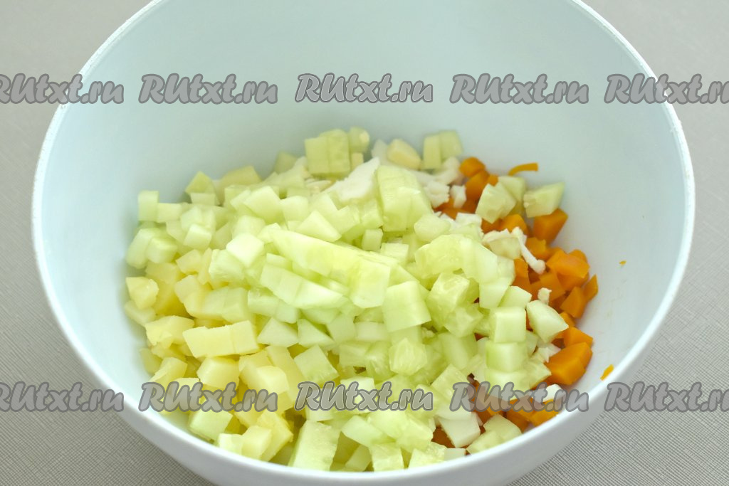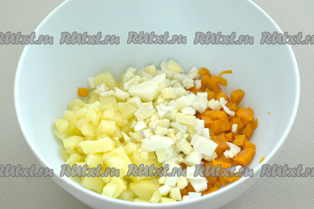 Непосредственно перед приготовления салата "Оливье" очищаем варёные овощи и яйца. Нарезаем картошку и морковь на маленькие кубики и складываем в глубокую миску.