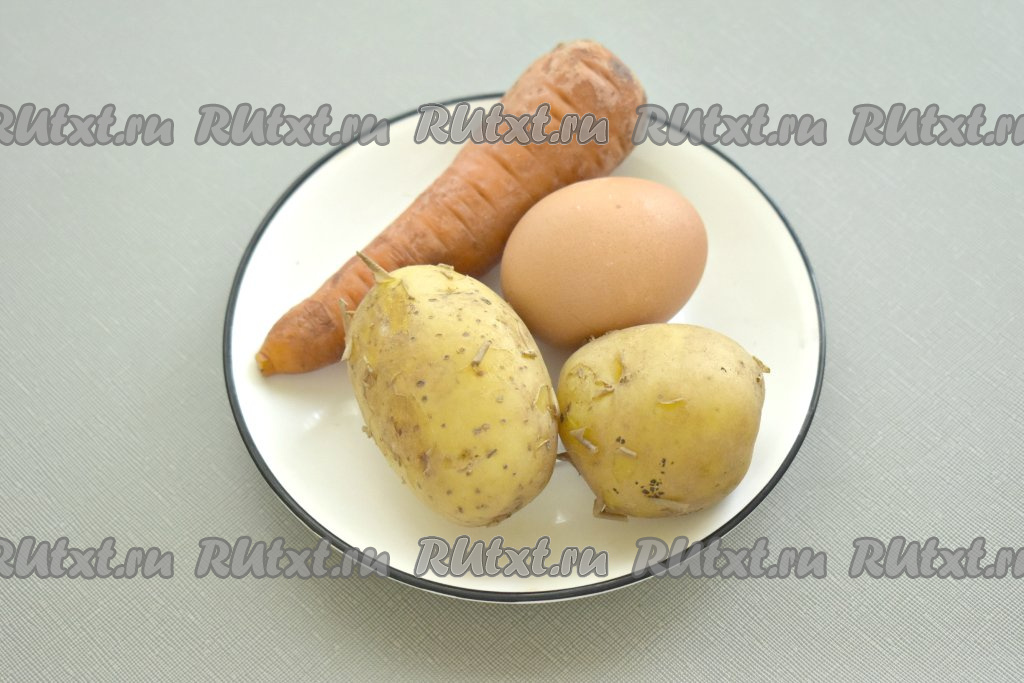 Отвариваем морковь и картошку, не очищая от кожуры, до готовности (картофель будет готов после начала кипения воды через 20-25 минут, морковь - через 25-35 минут, готовые овощи будут легко прокалываться вилкой). Варёные овощи перекладываем на тарелку, даём им остыть. Отвариваем яйца в течение 10 минут после начала кипения воды, после этого воду сливаем и, залив холодной водой, оставляем их до полного остывания.