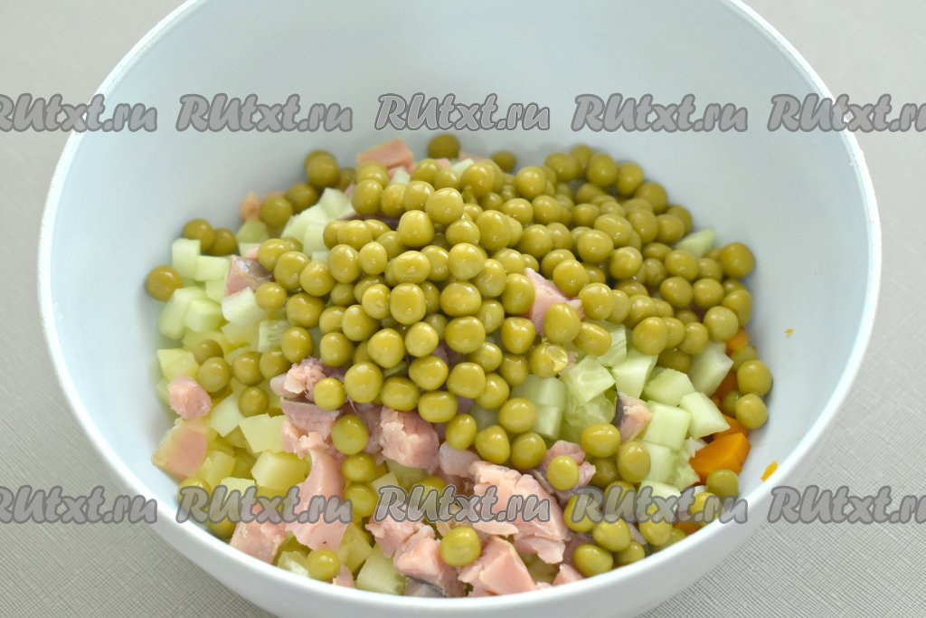 Зелёный консервированный горошек из банки сначала перекладываем на сито, чтобы стекла лишняя жидкость, а после этого тоже добавляем в миску.