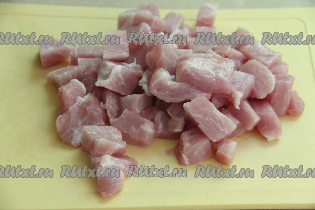 Нарезать мякоть свинины на кусочки размером 1 сантиметр на 1 сантиметр.