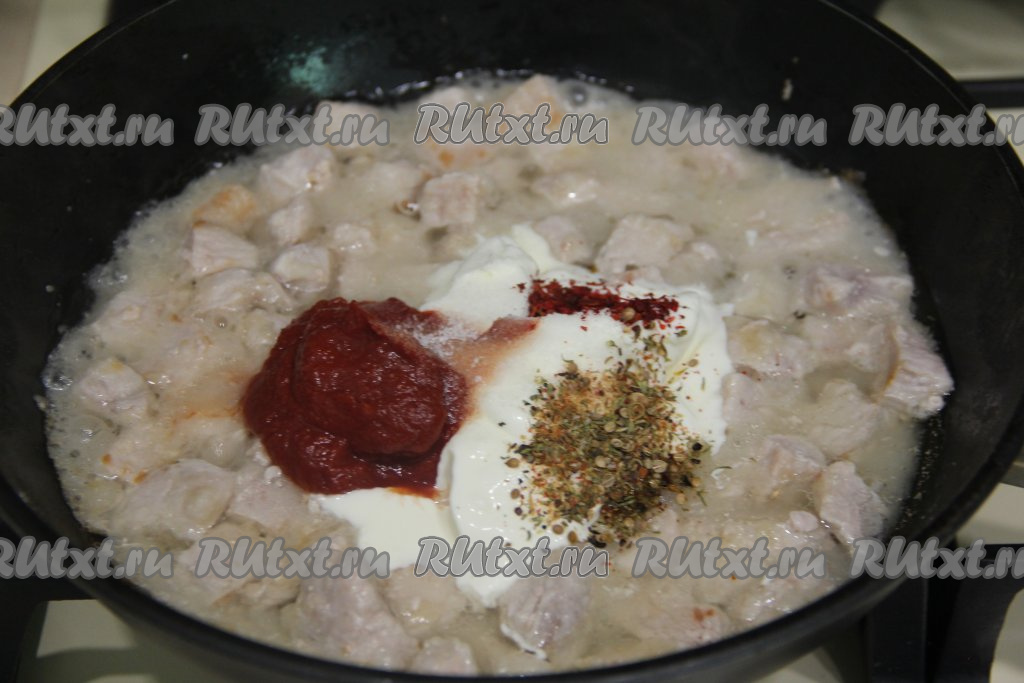 Тщательно перемешать, довести сметанно-томатный соус до кипения, уменьшить огонь до минимума, накрыть сковороду крышкой. Тушить свинину минут 15-20 (мясо должно стать мягким).