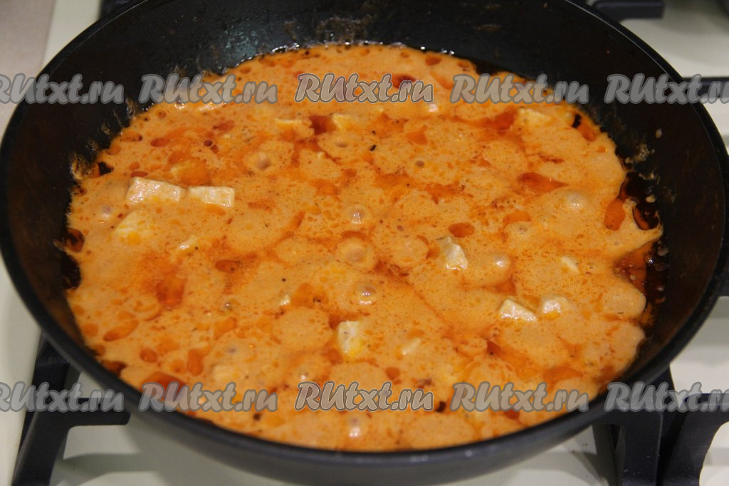 Влить воду в сковороду, перемешать. Добавить сметану, томатную пасту, соль и специи.