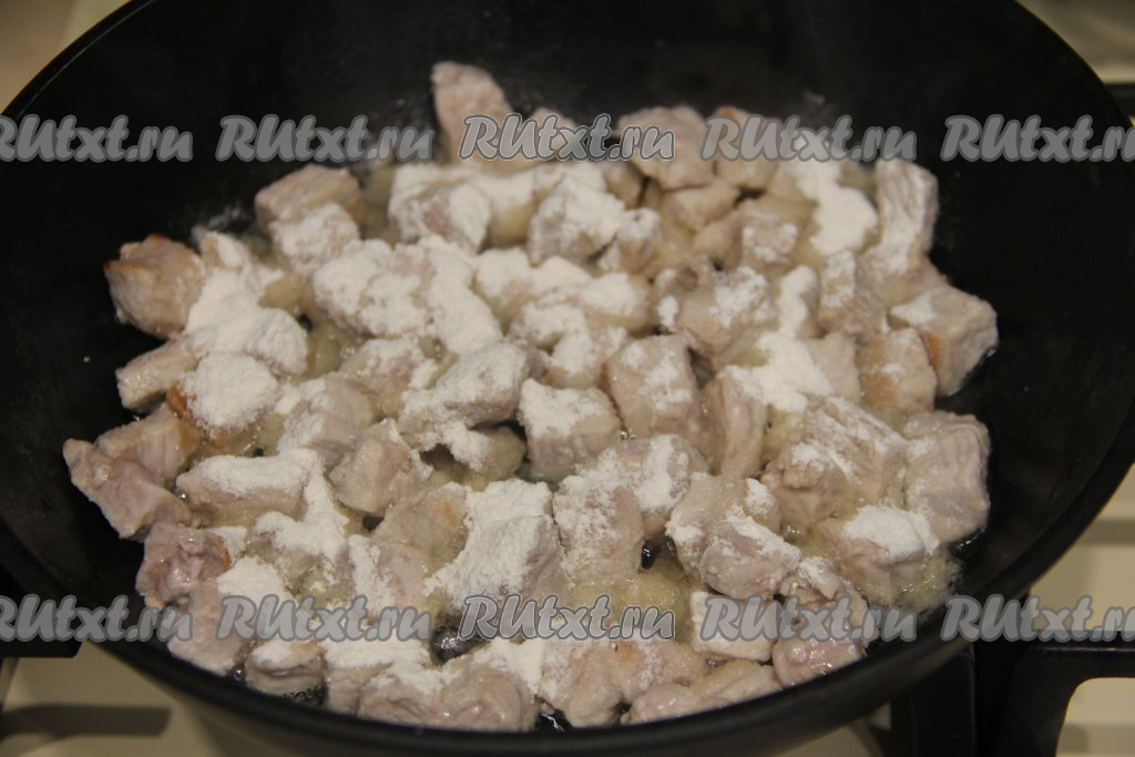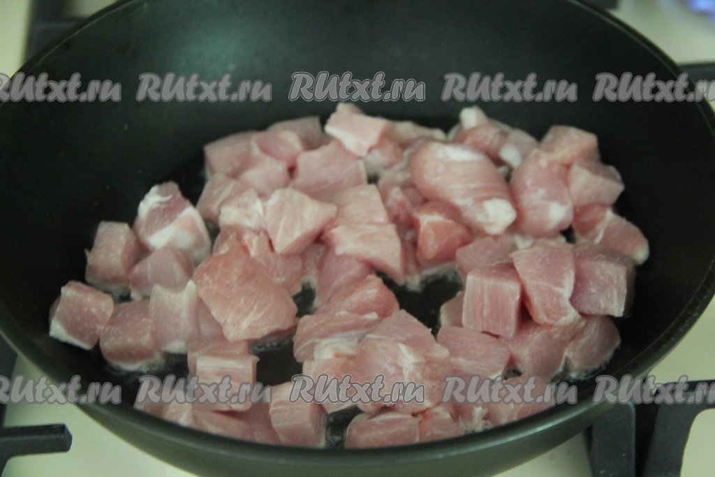 На среднем огне обжарить кусочки свинины в течение 10 минут, периодически перемешивая.