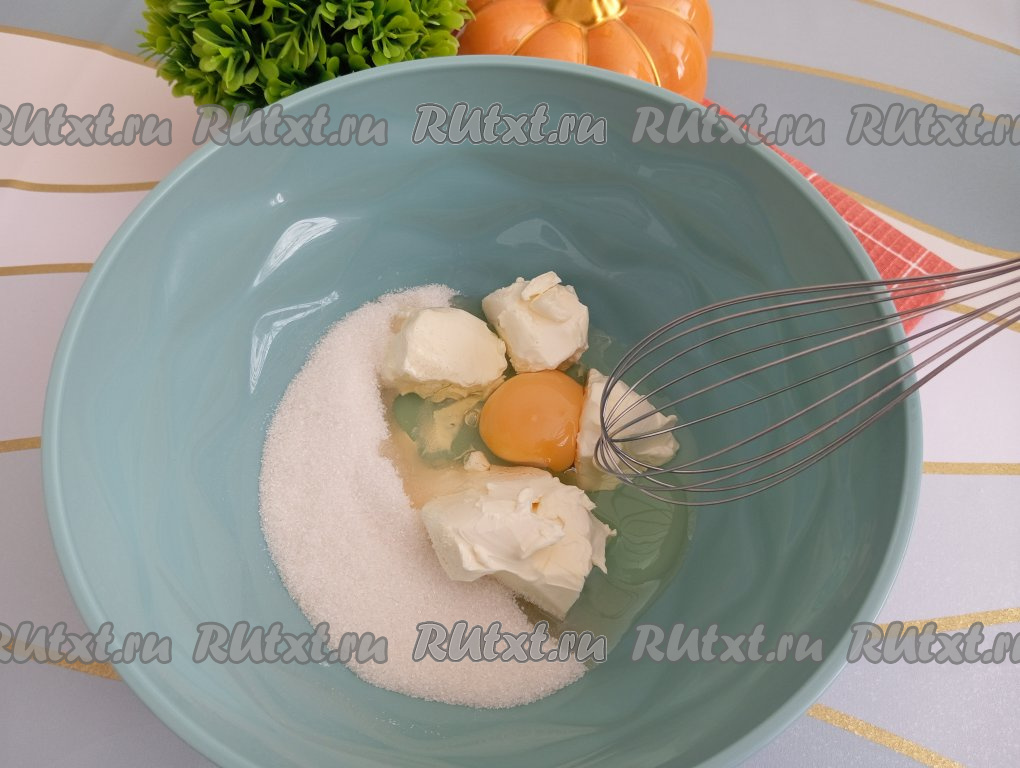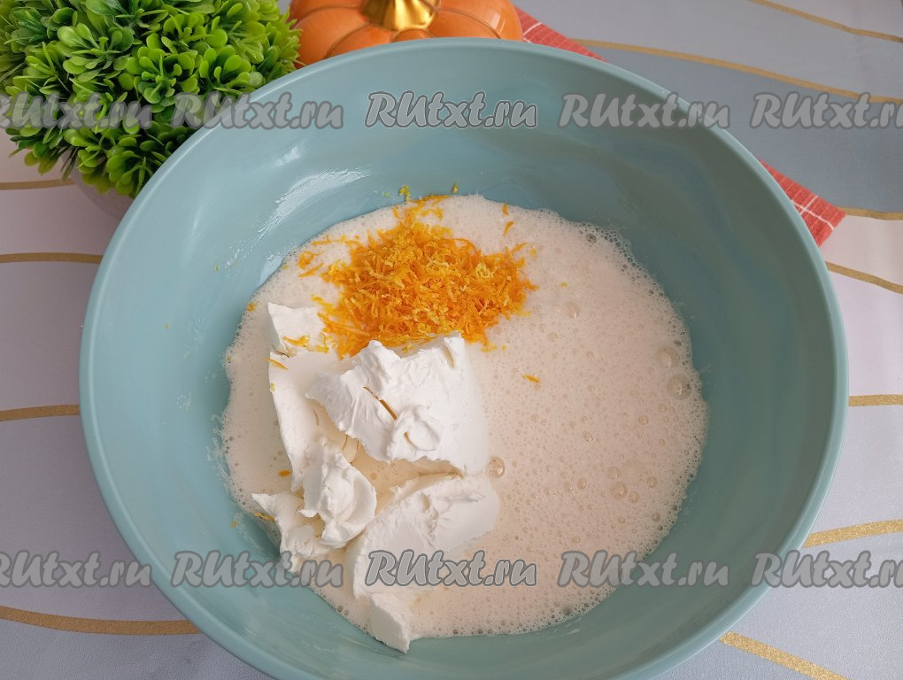 При желании в начинку можно добавить цедру апельсина, для этого с тщательного вымытого и обсушенного апельсина нужно с помощью тёрки снять 1 столовую ложку цедры, не затрагивая, находящийся под ней белый слой. В получившуюся смесь яиц и сахара добавляем творожный сыр и цедру апельсина, взбиваем миксером до однородности.