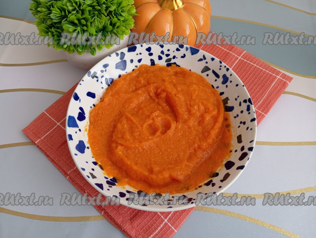 После того как тыква станет мягкой, достаём её из микроволновки, даём остыть и пробиваем погружным блендером до получения однородного тыквенного пюре.