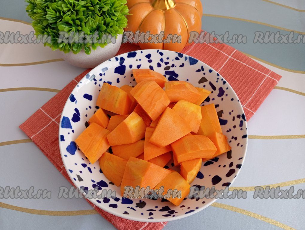 Сливочное масло для замешивания песочного теста должно быть комнатной температуры, поэтому его нужно достать из холодильника заранее. 350 грамм тыквы, очищенной от семян и кожуры, нарезаем на небольшие кубики и запекаем до мягкости в микроволновке на максимальной мощности (в зависимости от величины кусочков тыквы и её сорта на запекание обычно требуется 5-7 минут).