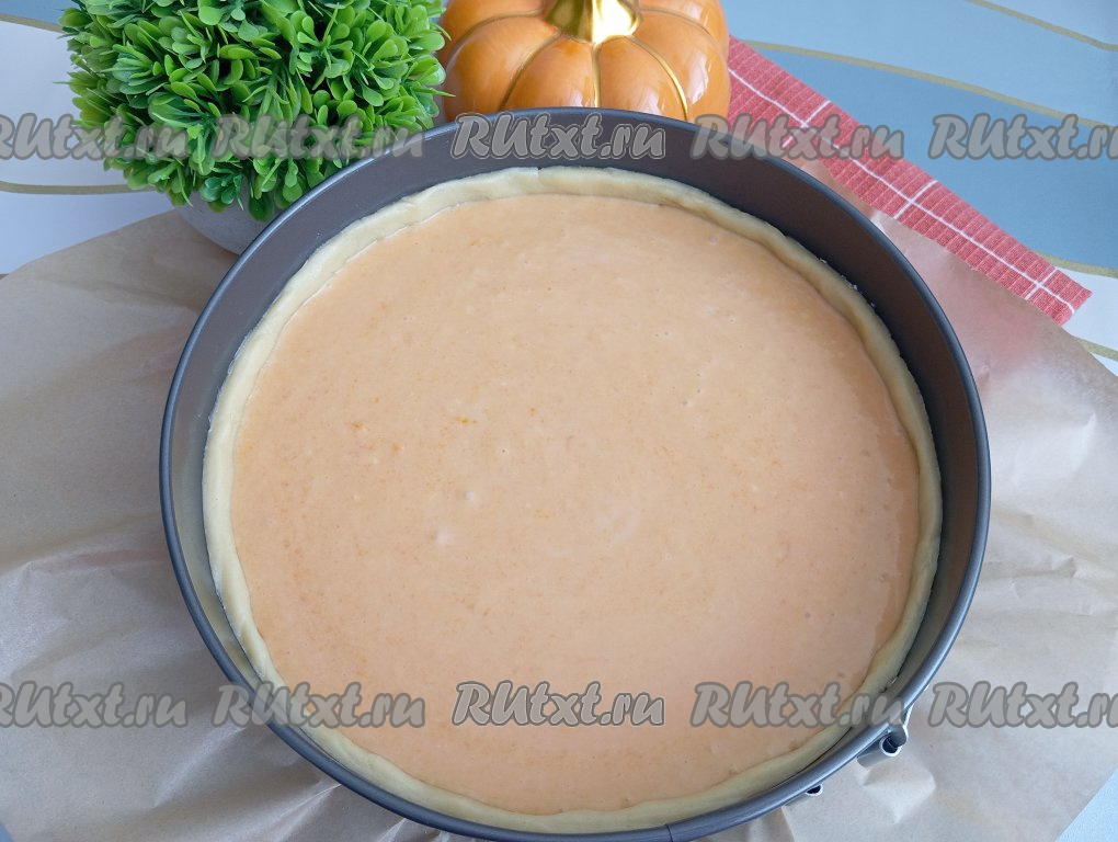 Форму с охлаждённым тестом достаём из холодильника. Вливаем аккуратно начинку поверх теста, равномерно распределяем. Отправляем форму в духовку, разогретую до 170 градусов, выпекаем тыквенный чизкейк с творожным сыром минут 50.