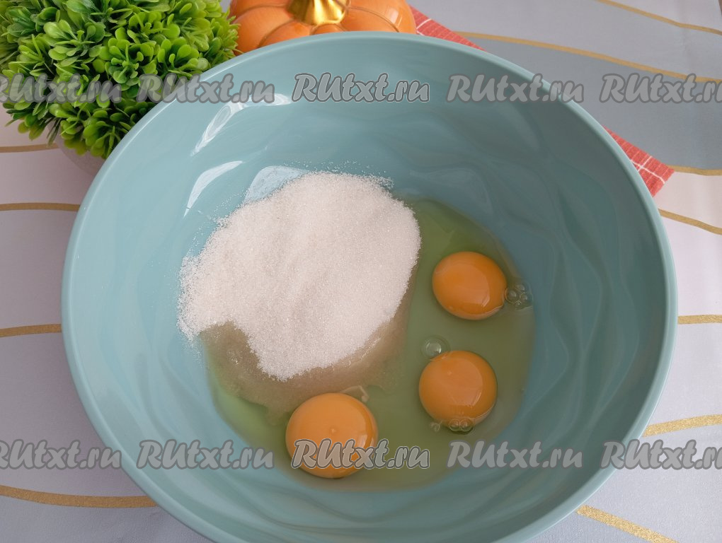 Для приготовления начинки в глубокую миску вбиваем яйца, добавляем сахар, соль, по желанию, на этом этапе можно добавить 1 чайную ложку корицы, взбиваем миксером до однородности.