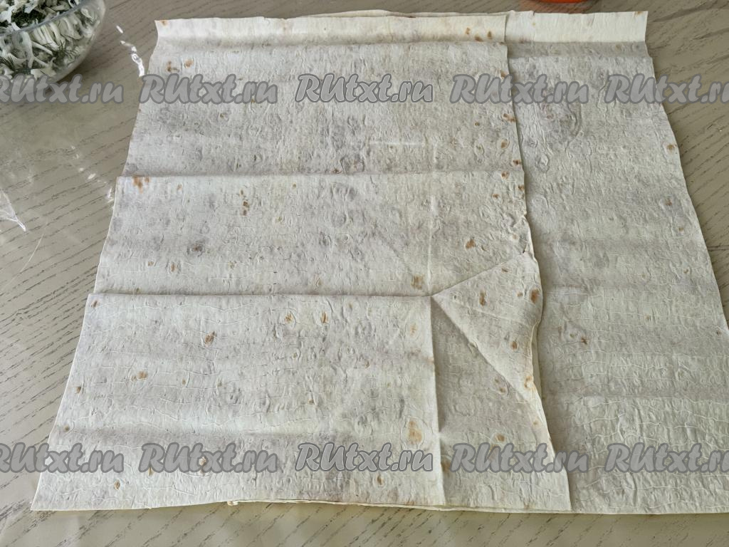Лаваш разрезать пополам. Получившиеся 2 листа лаваша выложить один на другой немного внахлёст, как на фото.