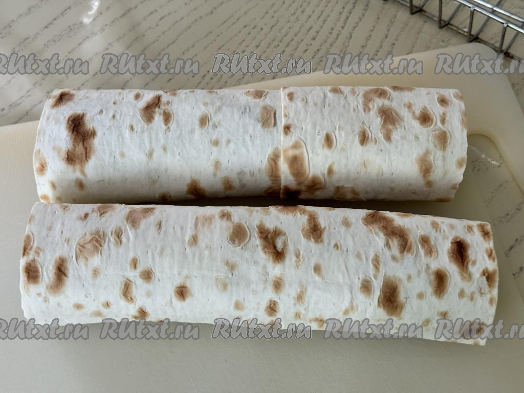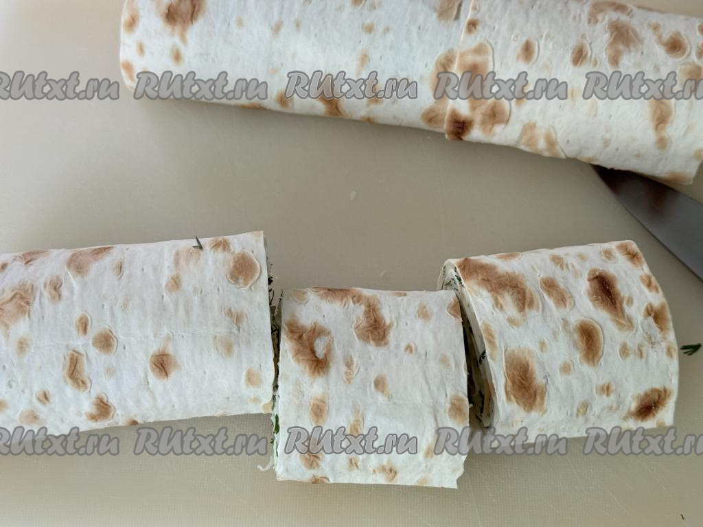 Свернуть лаваш в рулет, начиная с более длинной стороны лаваша. Слегка прижать рулет сверху рукой, чтобы он стал более плоским.