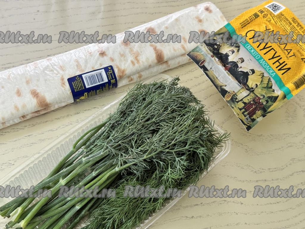Подготовить продукты. Для этого блюда можно взять любой твёрдый или полутвёрдый сыр на ваш вкус, я взяла сулугуни. В качестве зелени можно взять укроп, петрушку, базилик, зелёный лук или кинзу. Зелень промыть и обсушить.