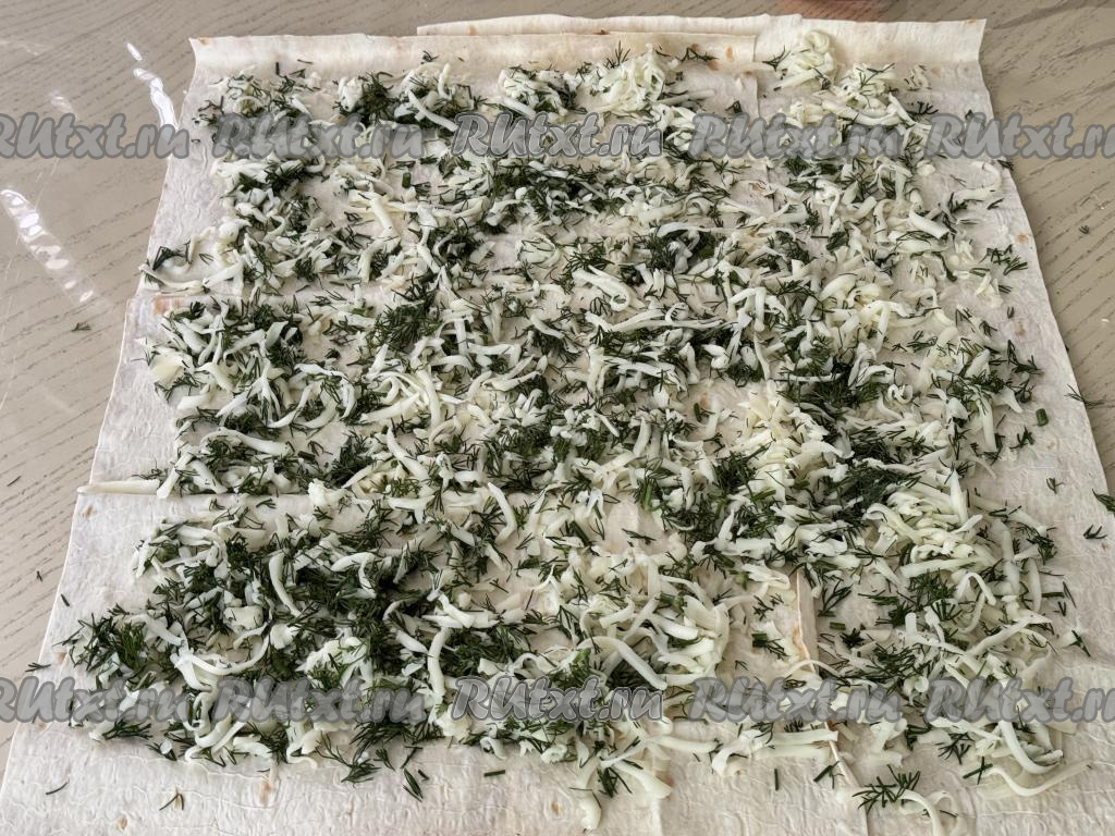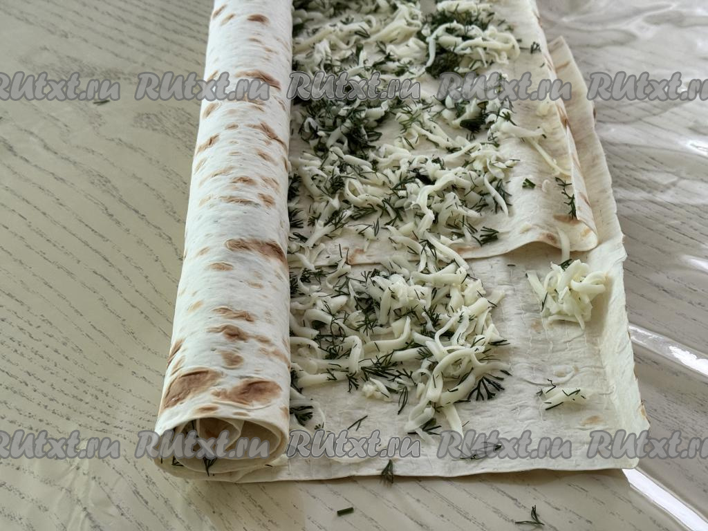 Поверх листов лаваша, сложенных внахлёст равномерно выложить начинку из сыра и зелени, отступая от краёв лаваша по 1-1,5 сантиметра.