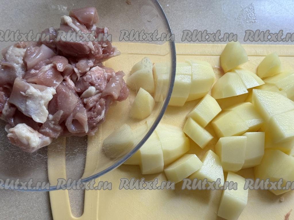 Филе куриных бёдер промыть водой, обсушить, нарезать на кубики с размером стороны примерно 2 сантиметра. Картошку нарезать на кубики с размером стороны ориентировочно 3 сантиметра.
