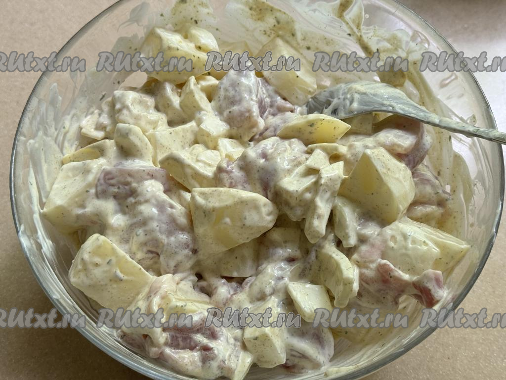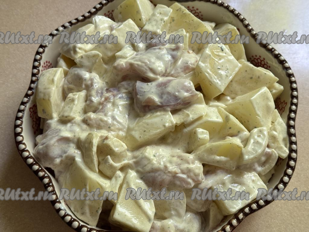 Перемешать картошку с куриным мясом, покрывая их сметаной и майонезом со всех сторон.