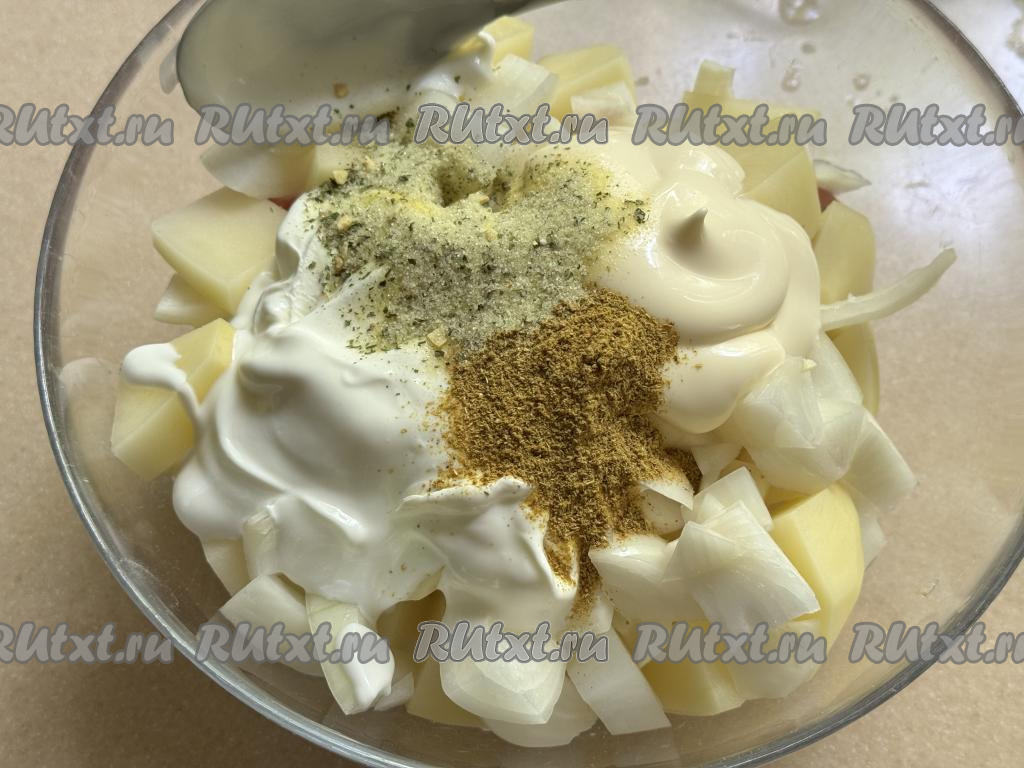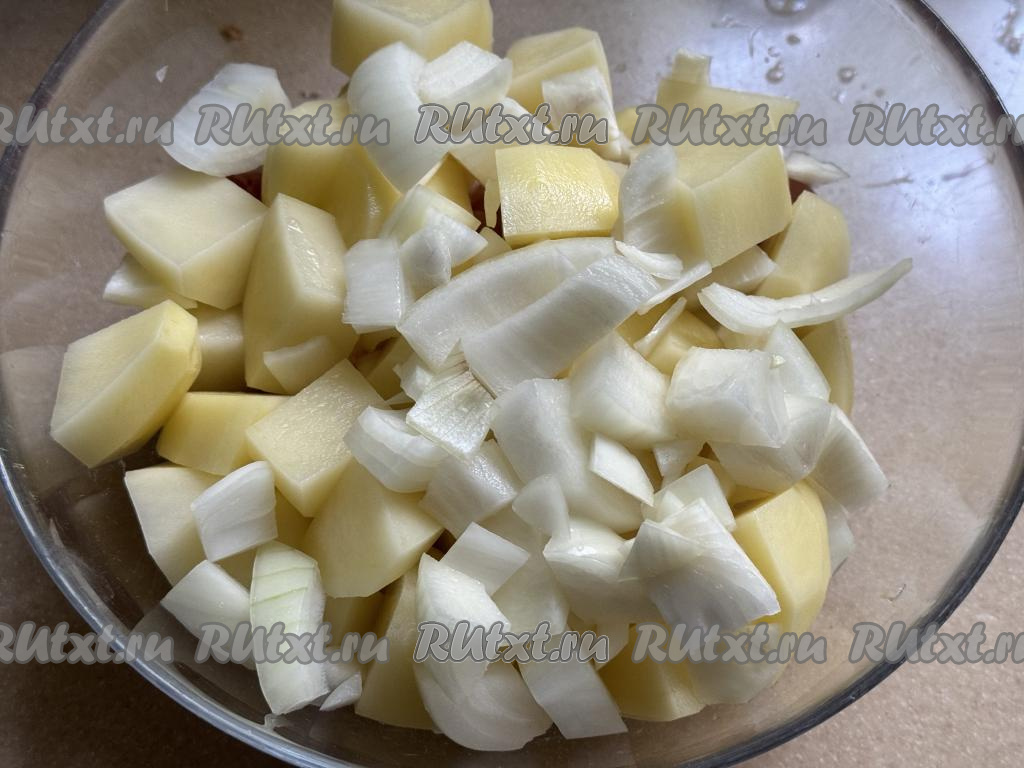 Соединить в миске картошку и филе куриных бёдер, добавить лук, нарезанный на четверть кольца (мелко нарезать не нужно).