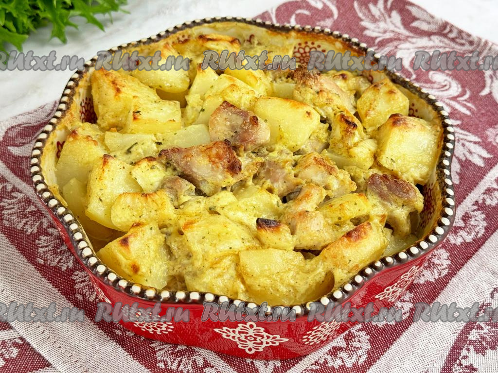 Готовое блюдо достать из духовки. Картошка получается мягкой, аппетитной, кусочки филе бёдер курицы - сочными, нежными.