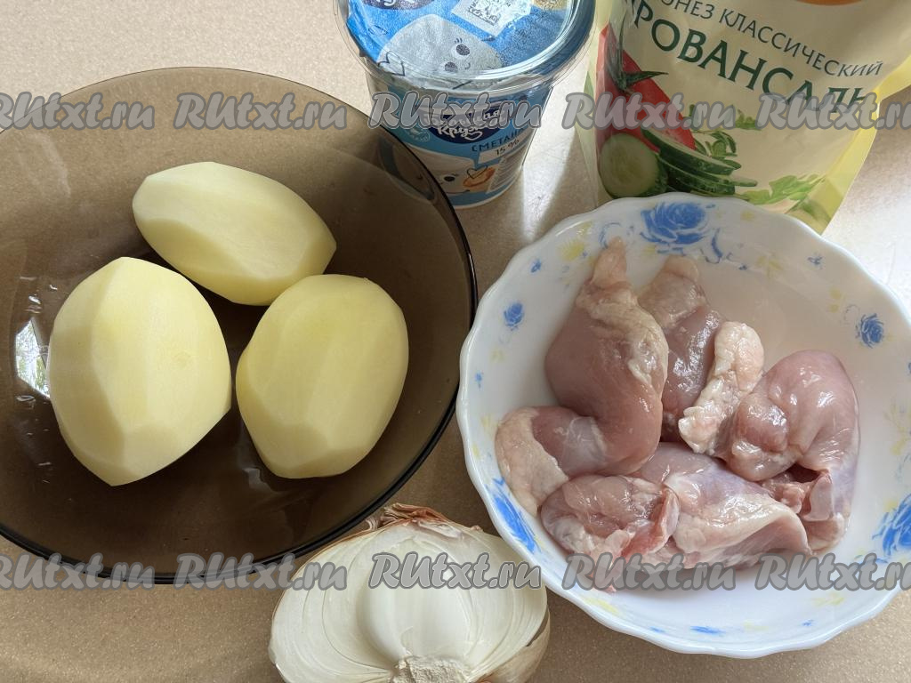 Подготовить продукты. Картошку и лук почистить. Сметану можно использовать любой жирности (у меня - жирностью 20%). Для этого блюда можно купить филе бёдер курицы, уже отделённое от костей. А можно приобрести бёдра курицы и отделить их от костей в домашних условиях, удаляя ещё и кожу.