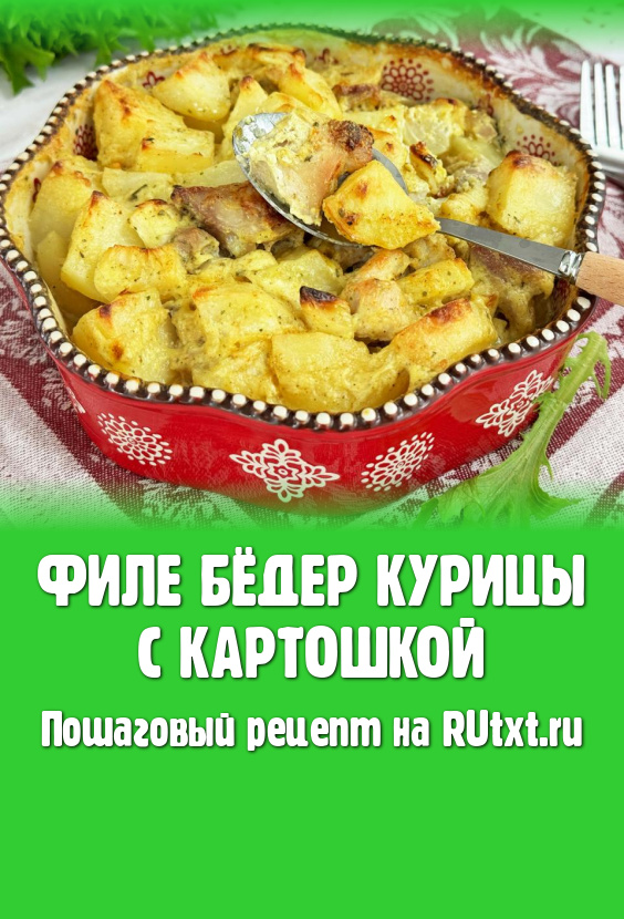 Филе куриных бёдер достаточное сочное, поэтому многие блюда с ним получаются особенно вкусными. В этот раз предлагаю приготовить в духовке филе бёдер курицы с картошкой. Мясо получается нежным, сочным, а кусочки картофеля - мягкими, аппетитными. Блюдо, приготовленное по этому простому рецепту, идеально подходит для обеда или ужина, при подаче его можно дополнить свежими или маринованными овощами.