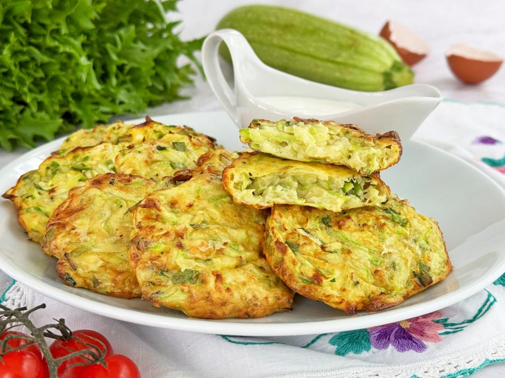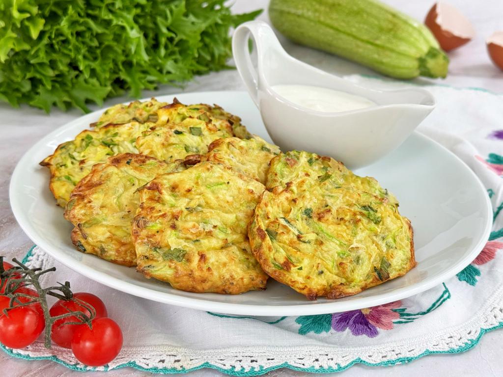 Вкусные, аппетитные, нежные оладьи, приготовленные из кабачков в аэрогриле, подать к столу со сметаной.