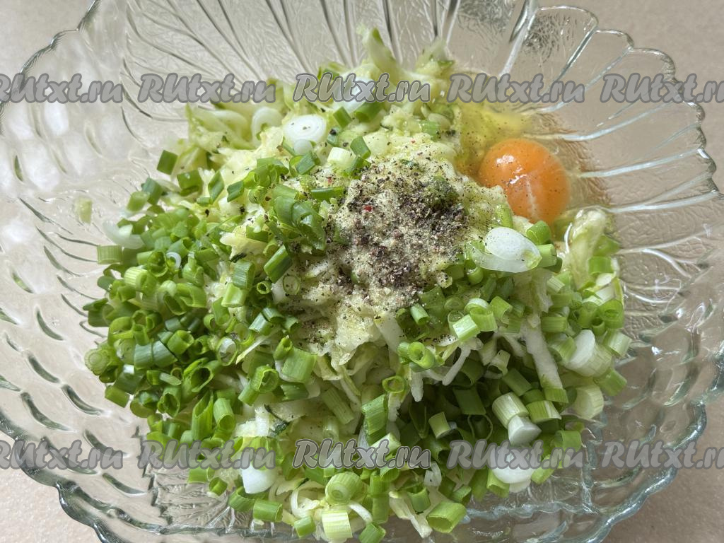 К кабачковой массе, обжатой от лишнего сока, добавить мелко нарезанную зелень.