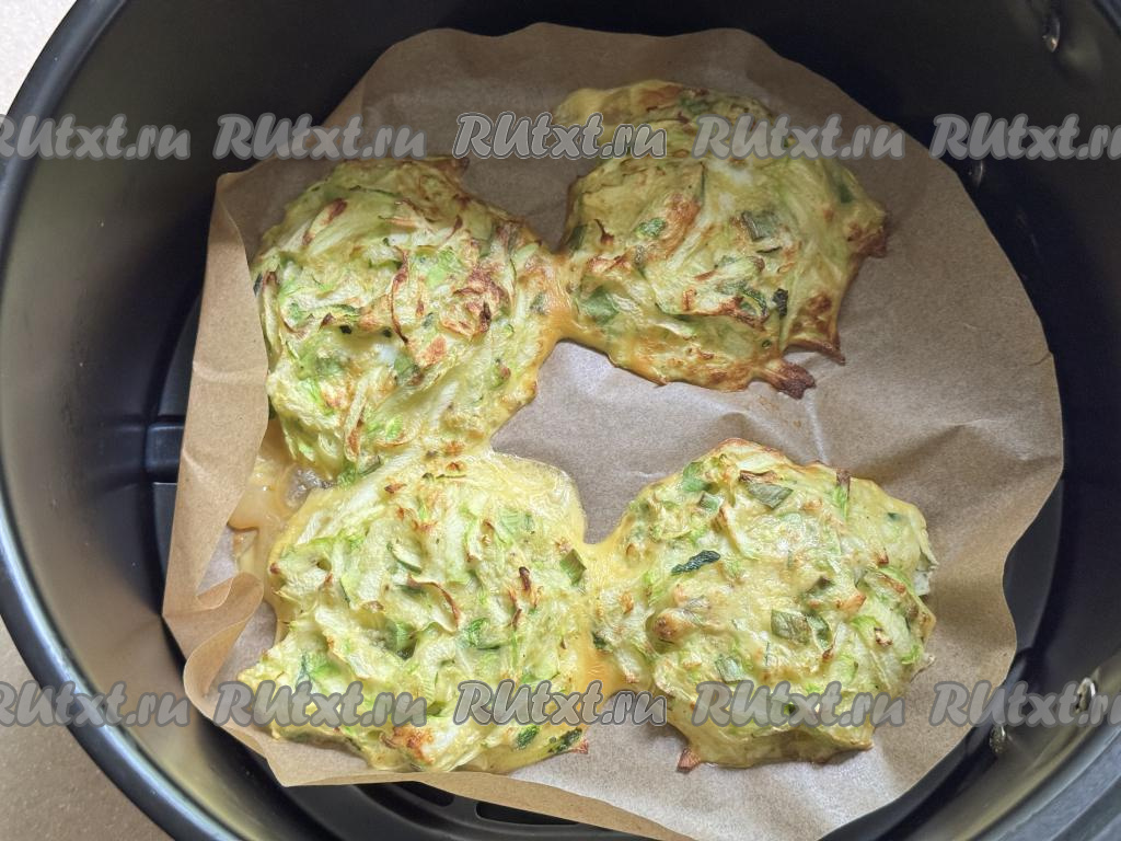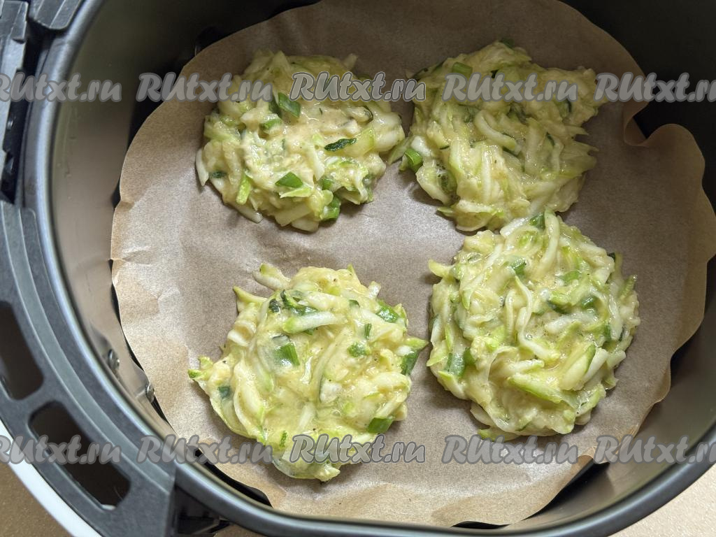 Дно чаши аэрогриля застелить пергаментом, затем выкладывать по 1 столовой ложке кабачковой массы в виде круглых оладий. Готовить оладьи в закрытом аэрогриле 10 минут при температуре 180 градусов.