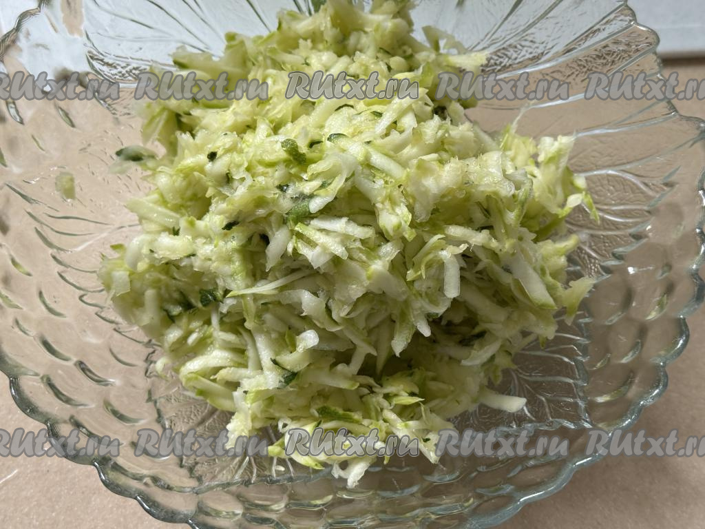 500 грамм подготовленного кабачка натереть на крупной тёрке в глубокую тарелку.