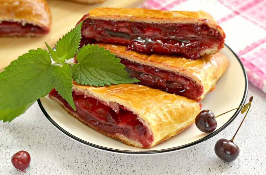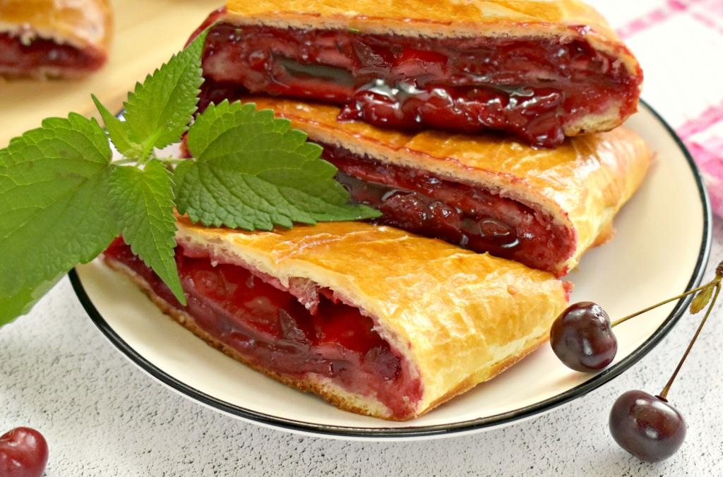 Готовую выпечку достаём из духовки, даём остыть, а затем нарезаем на кусочки и подаём к столу. Формируется штрудель из слоёного дрожжевого теста и просто, и быстро, а получается нежным, аппетитным. Сочная, яркая, насыщенная начинка из вишни делает эту выпечку необыкновенно вкусной!