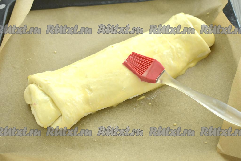 Сворачиваем тесто с начинкой в рулет, начиная со стороны без подгиба. Плотно скрепляем конец рулета. На противень, застеленный пергаментом (или ковриком) для выпечки выкладываем сформированный штрудель швом вниз. Поскольку штрудель формируется из дрожжевого слоёного теста, его нужно оставить на расстойку при комнатной температуре минут на 20 (благодаря расстойке, штрудель станет более воздушным в процессе выпечки). По прошествии 20 минут в небольшой ёмкости взбиваем вилкой яичный желток до однородности. С помощью силиконовой кисточки смазываем поверхность штруделя взбитым яичным желтком.