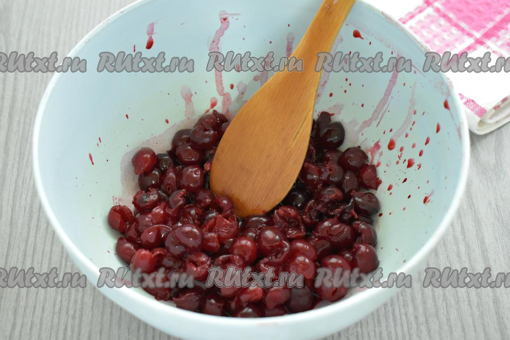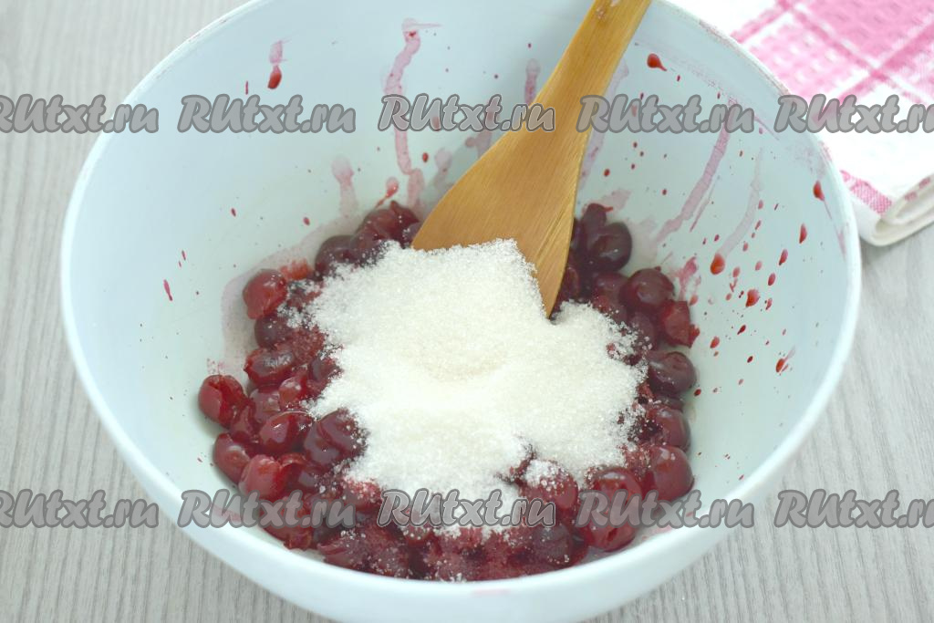 Подготовленную вишню без косточек выкладываем в миску, всыпаем сахар, перемешиваем и оставляем на 10-15 минут, чтобы ягоды выделили сок.