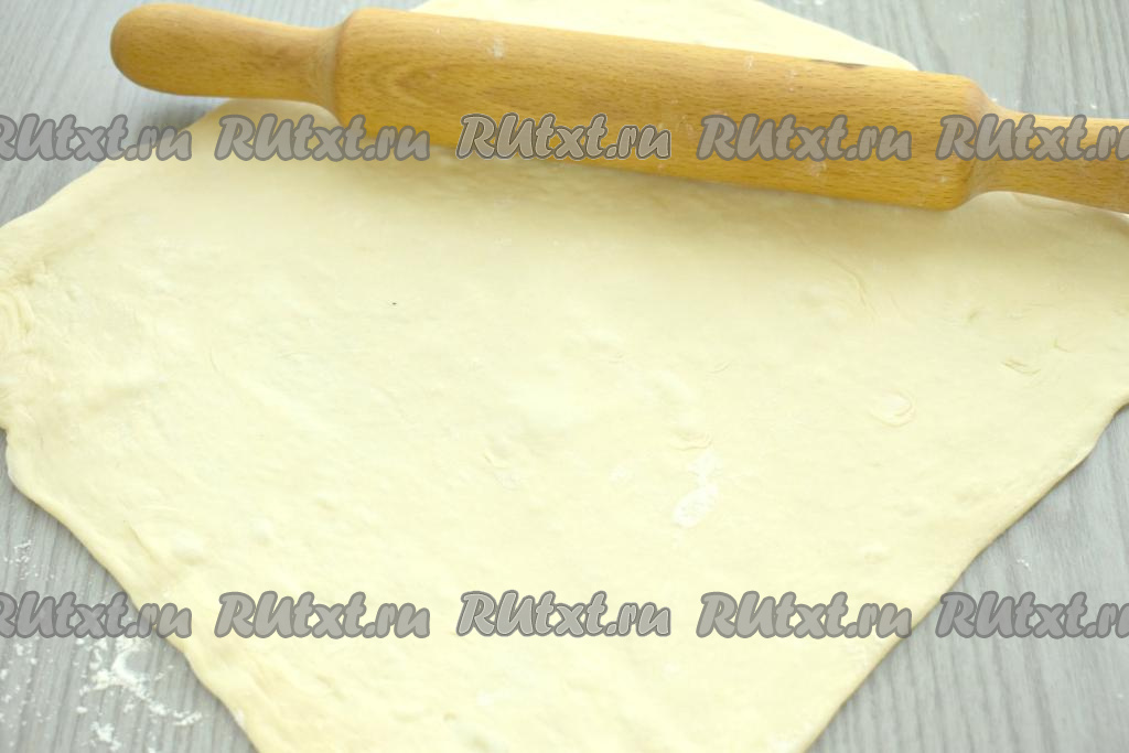 Пока начинка остывает, размораживаем при комнатной температуре слоёное дрожжевое тесто. После того как начинка остынет и тесто разморозится, на присыпанном мукой столе раскатываем тесто в квадрат со стороной 28-30 сантиметров.