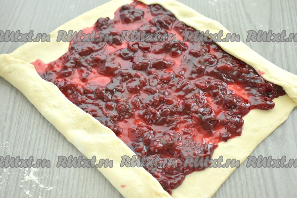 Остывшую вишнёвую начинку распределяем по раскатанному тесту, отступая от краёв теста по 2 сантиметра. Противоположные края теста немного подгибаем.