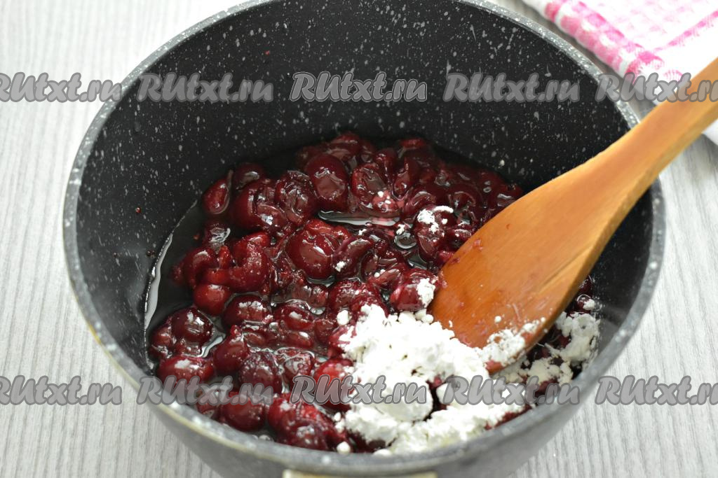 Затем вишню вместе с соком выкладываем в кастрюлю с толстым дном, добавляем крахмал, перемешиваем, ставим на минимальный огонь. Периодически перемешивая, доводим до кипения. В процессе закипания сахар начнёт плавиться, ягоды будут выделять сок, жидкости в кастрюле станет больше, поэтому огонь можно будет сделать средним (или выше среднего). После того как смесь вишни, сахара и крахмала закипит, провариваем её, помешивая, минуты 2-3 (до загустения). Снимаем начинку для штруделя с огня и даём остыть.