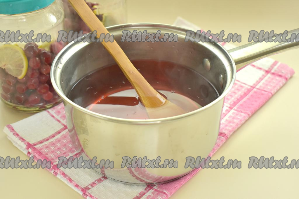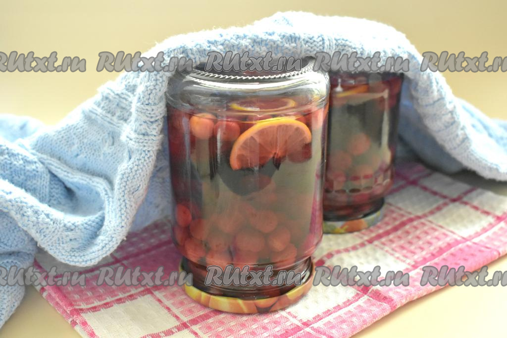 Сразу горячий сироп разливаем по банкам с вишней, заполняя их до самого верха. Закручиваем (или закатываем) банки с компотом крышками, переворачиваем вверх дном. Накрываем банки пледом (или полотенцем) и оставляем их до полного остывания.