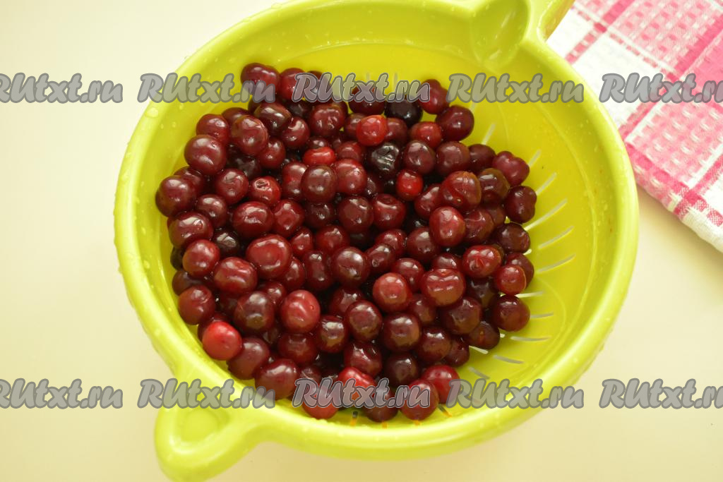 Вишню перебираем, удаляем подпорченные ягоды, листья и веточки. Выкладываем вишню в дуршлаг и тщательно промываем проточной водой. Оставляем в дуршлаге на несколько минут, чтобы с вишни стекла лишняя вода.
