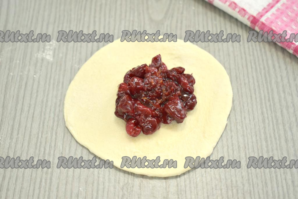 В центр каждой лепёшки помещаем 1 столовую ложку остывшей вишнёвой начинки.