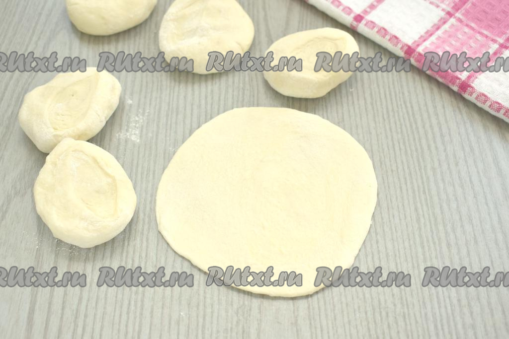 Кусочки теста ставим на срез и раскатываем в лепёшки диаметром ориентировочно 12-13 сантиметров.