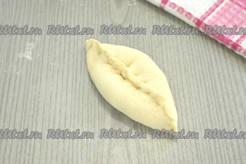Скрепляем хорошо края лепёшки над начинкой, формируя пирожок. Сверху пирожок из слоёного теста слегка прижимаем ладонью. Так лепим все пирожки.