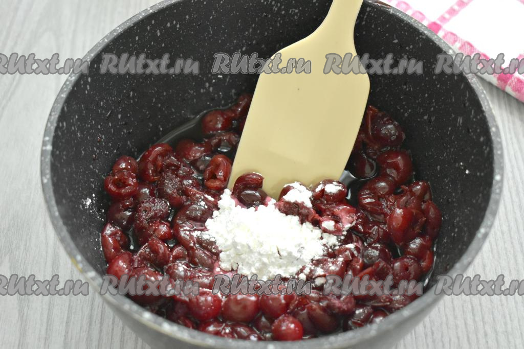 По прошествии 10-15 минут к вишне, смешанной с сахаром, добавляем кукурузный (или картофельный) крахмал, перемешиваем и ставим на небольшой огонь. Периодически перемешивая, доводим до кипения. В процессе нагревания из ягод будет выделяться сок, сахар начнёт таять и в кастрюле увеличится количество жидкости, поэтому огонь можно будет увеличить до среднего, чтобы вишнёвая масса закипела быстрее. После закипания, уменьшив огонь, провариваем вишнёвую начинку, помешивая, до загустения (ориентировочно начинка становится достаточно густой минуты через 2 с момента закипания). В процессе варки пробуем начинку на вкус, если сладости вам будет недостаточно, можете добавить сахар по вкусу. Загустевшую вишнёвую начинку для пирожков из слоёного теста убираем с огня, даём полностью остыть.