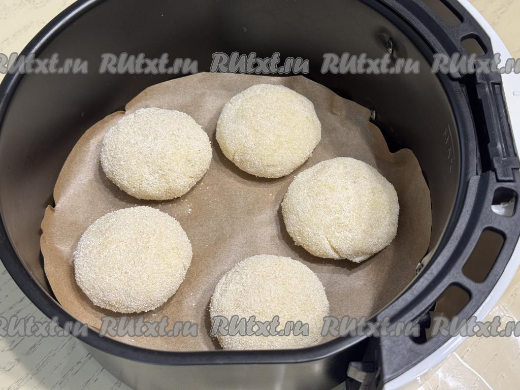 Дно чаши аэрогриля выстелить пергаментом, выложить сформированные картофельные котлеты.