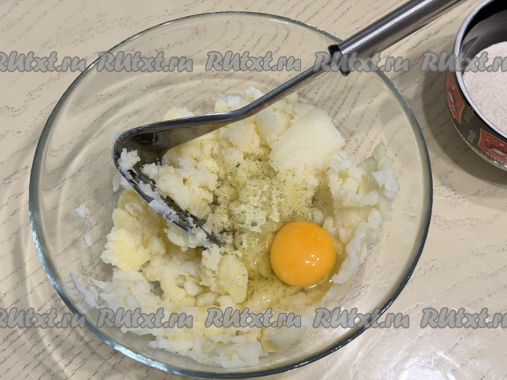Очищенную картошку выложить в кастрюлю, залить полностью водой, поставить на сильный огонь, после закипания, подсолив воду и уменьшив огонь, варить до готовности картофеля (минут 20-25, картошины должны стать достаточно мягкими, легко прокалываться ножом), затем воду, в которой варились клубни, слить. Для этого блюда можно использовать и картофель, оставшийся от ужина или обеда. Выложить варёную картошку в миску, дать немного остыть, размять толкушкой, добавить яйцо и любые специи. Если нужно, подсолить. Ещё раз размять картофельную массу до однородности.